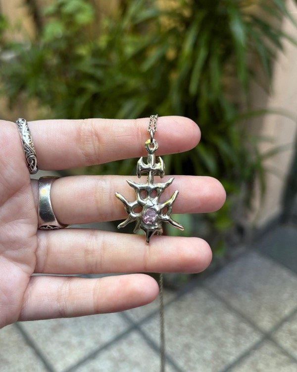Dije de alpaca hecho a mano con la técnica de cera perdida. Cadena y fornituras de alpaca con zirconia rosa en forma de gota. Joya única en stock.