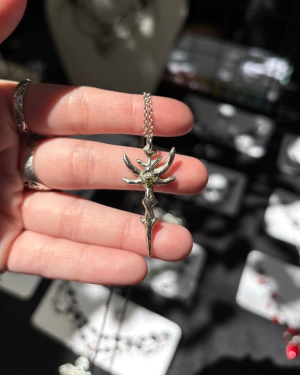 Dije de alpaca hecho a mano con la técnica de cera perdida. Cadena y fornituras de alpaca con zirconia verde. Joya única en stock.